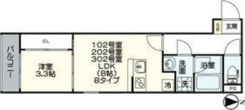 | 間取り詳細 | その他 3.3畳 、 LDK 8畳 |