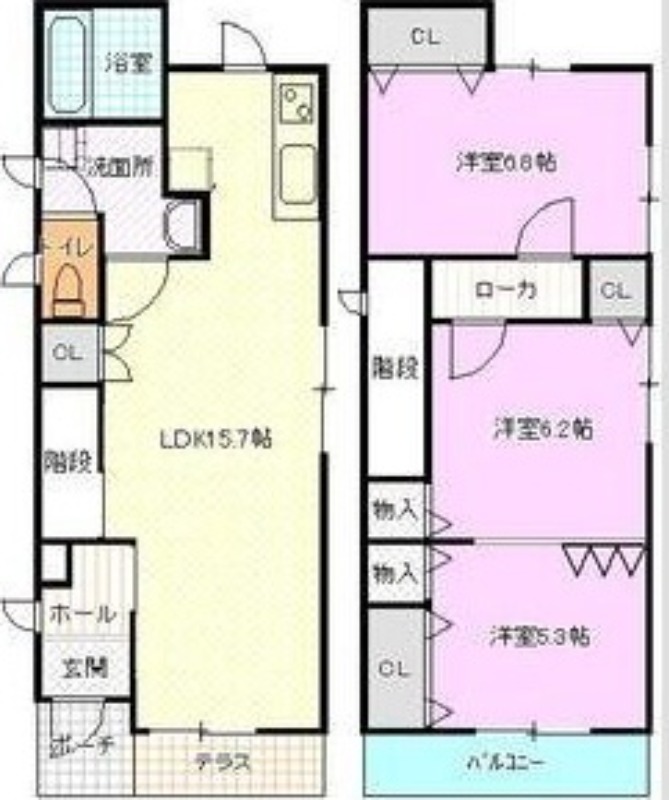 | 間取り詳細 | LDK 15.7畳 、 洋室 6.8畳 、 洋室 6.2畳 、 洋室 5.3畳 |